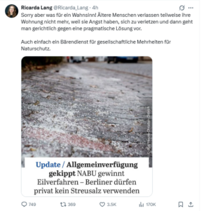 Lang bringt auf den Punkt, was viele Berliner denken: Wenn ältere Menschen in ihren Wohnungen gefangen sind, weil sie Angst vor einem Oberschenkelhalsbruch haben müssen, dann ist Umweltschutz mit der Brechstange einfach nur weltfremd. Lang warnt sogar davor, dass solche Aktionen dem Naturschutz einen „Bärendienst“ erweisen. Recht hat sie!